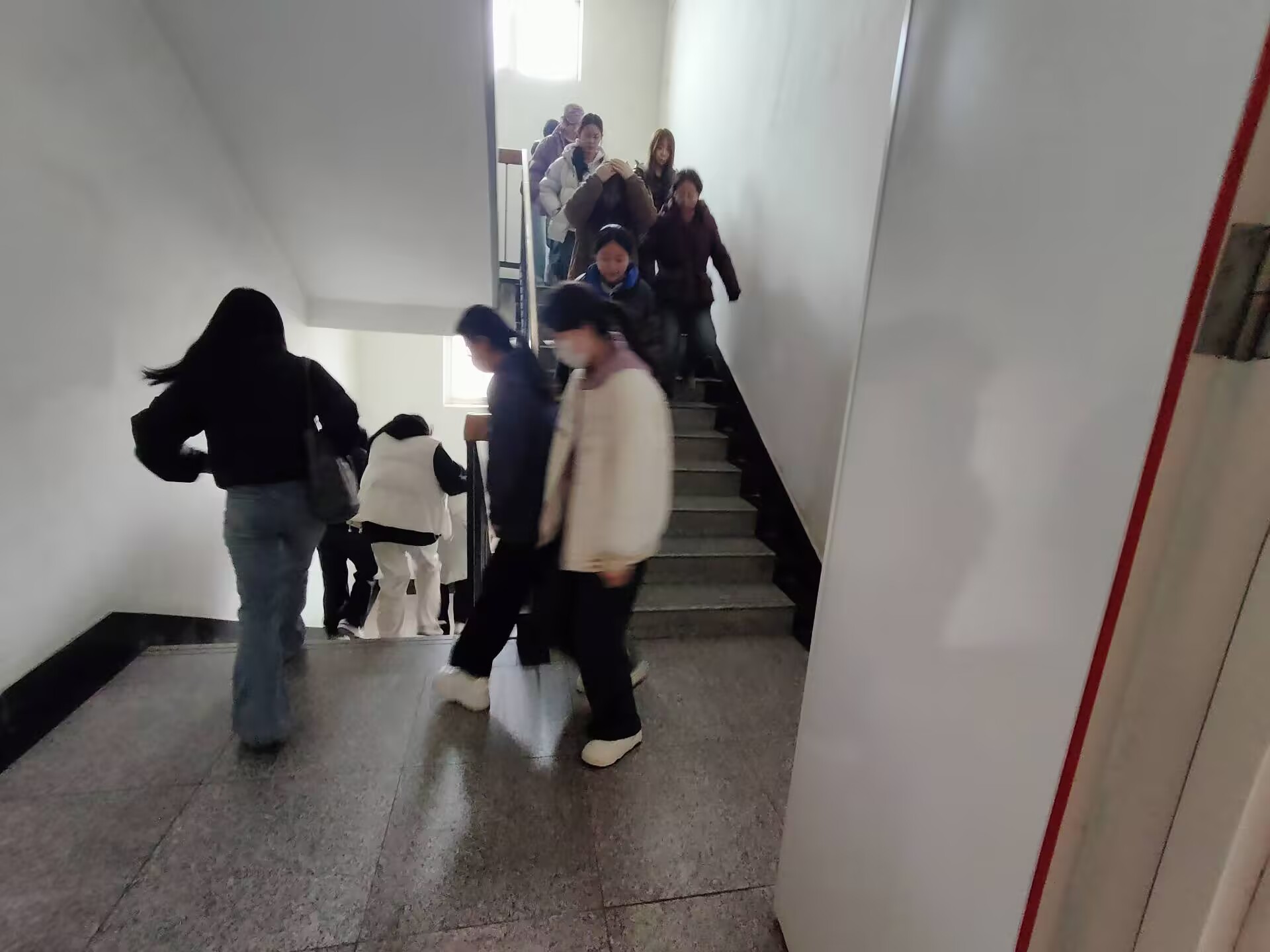 疏散警报信号声响起,各楼层学生迅速按照地震应急疏散路线,俯身弯腰、用手护住头部,迅速、有序疏散到指定应急避险场所。老师们在各楼层楼梯口指挥疏导,防止拥挤踩踏。