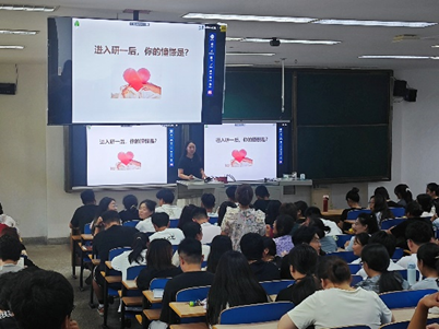 讲座由“破冰活动”拉开序幕,同学们依次接龙回答“研究生生活的憧憬是什么”。讲座紧扣“延续梦想,从心启航”这一主题,引出研究生新生心理发展阶段、心理困惑以及调适方法的三个方面。梁冀宁老师的讲解循序渐进,由表及里,层层展开。首先,她提出,研究生阶段是一个重要的心理发展阶段。同学们求知欲广、好奇心强,会投入大量时间进行科学研究、实习实验,这些可能会导致同学们心理压力过大,如对失败的恐惧、对成功的追求等。因此,针对研究生的心理健康教育尤为重要。