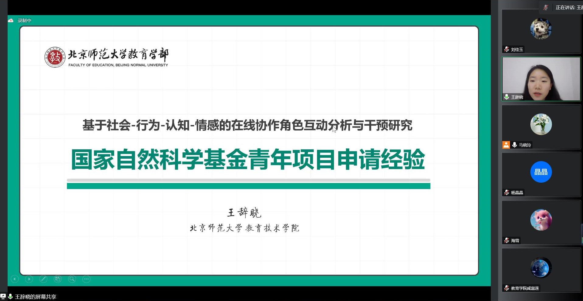 10月26日晚,教育学院教育技术学位点邀请北京师范大学王辞晓博士、江南大学马志强教授在线开展国家科学基金项目申请经验分享专题讲座。讲座由我院马晓玲副教授主持,教育学院教师和本科生、研究生共100余人聆听了本次讲座。