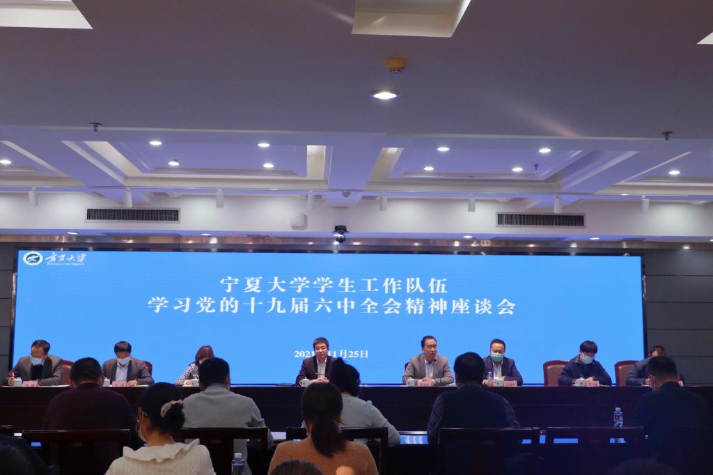 【宁夏大学新闻中心讯 姚硕/文、王佳梅/图】为深入学习贯彻习近平总书记重要讲话精神和党的十九届六中全会精神,推动我校学生工作队伍党史学习教育走实走深,11月25日,我校召开学工队伍学习党的十九届六中全会精神座谈会。校党委常委、副校长周震出席座谈会,党委学生工作部部长、学生处处长罗进德主持会议。