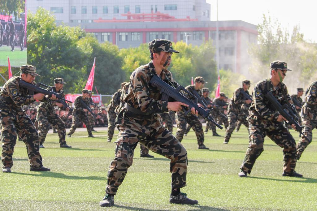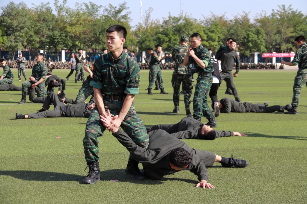 分列式后进行了刺杀操、擒敌拳、防暴队形、分队战术、匕首操、教官制暴术及军歌展演的汇报科目表演,场上队形变换迅速,整齐划一;动作刚劲有力,虎步生风;歌声豪情万丈,势破云霄;现场高潮迭起,掌声雷动。