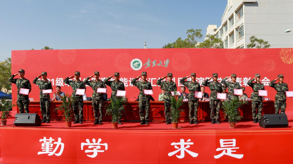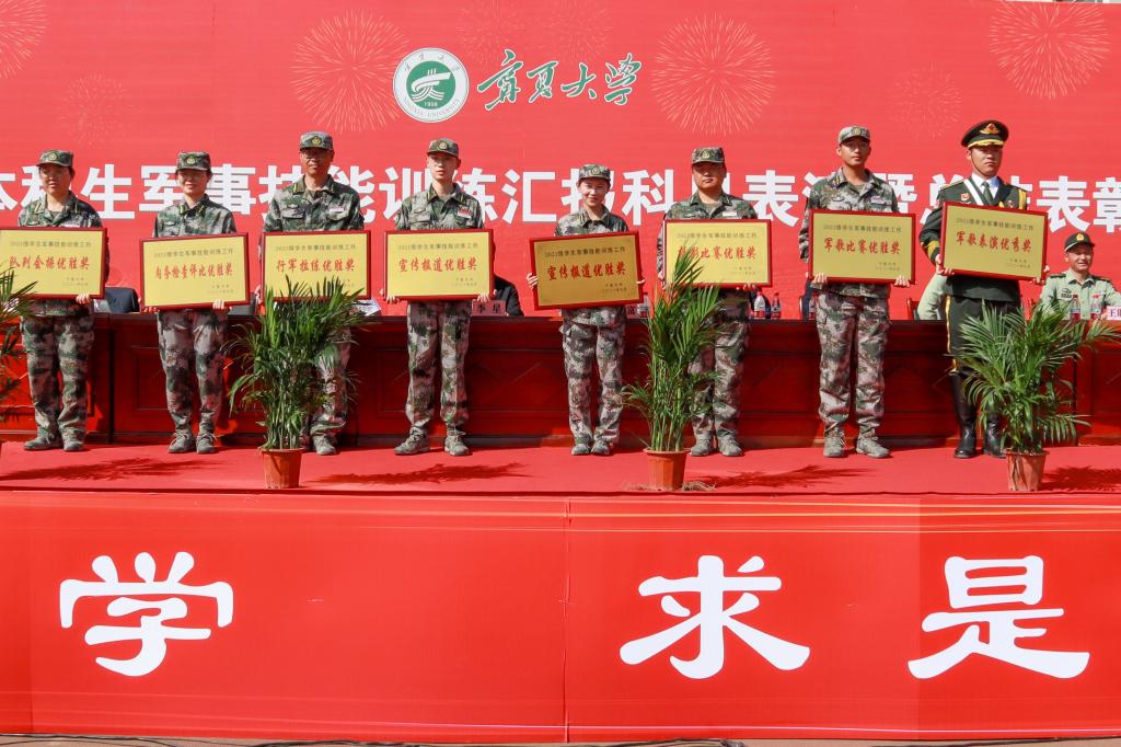 汇报表演结束后,全体奏唱国歌。校党委常委、副校长谢应忠宣读《宁夏大学2021级本科生军训工作先进单位及先进个人表彰决定》,数学统计学院等10个军训工作先进单位、土木与水利工程学院等7个单项优胜奖获得单位、杨阳等269名先进个人受到表彰。