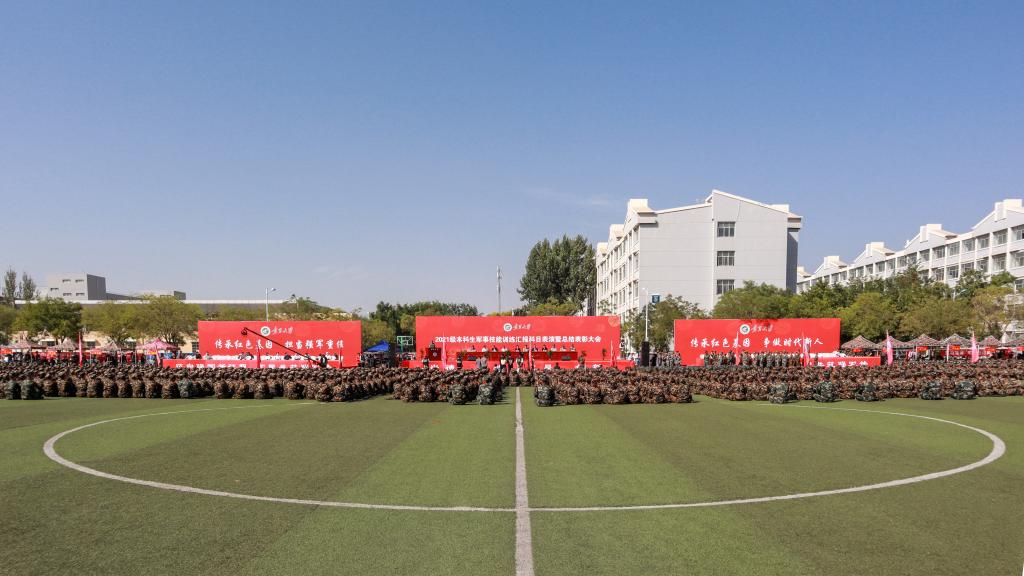 校党委常委、副校长周震作军训总结讲话。他代表学校向帮助指导我校军训工作的宁夏军区、自治区教育厅、武警宁夏总队表示诚挚感谢,向承担我校2021级学生军训任务的武警宁夏总队银川支队的官兵致以崇高敬意,向参与组织这次军训工作的领导和老师表示亲切慰问,向胜利完成各项军训任务的新同学表示热烈祝贺。他指出,国防意识和军事素养是青年健康成长、报效国家和服务社会的基本素质。经历了严格正规、丰富有趣的训练之后,同学们磨练了意志,增强了体质,强化了组织纪律性,增进了团结和友谊。他希望同学们在今后的学习生活中胸怀大局,脚踏实地,把新时代青年学子的责任扛在肩上,用强大的爱国热情和奋斗豪情,注解无悔青春,实现卓越人生。